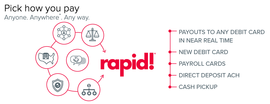 - Instant payout to existing bank accounts and reloadable debit cards including rapid! PayCard